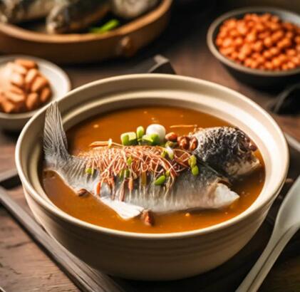原料:鲫鱼1条、赤豆50克、陈皮2-3片、姜2-3片、蒜适量、盐、胡椒粉少许。